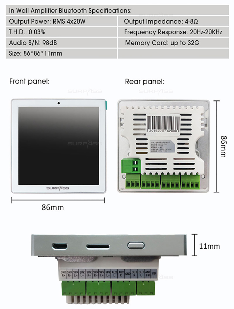4 Inch In Wall Amplifier Full Screen Touch Amplifier Mini Home Amplifier 4*20W