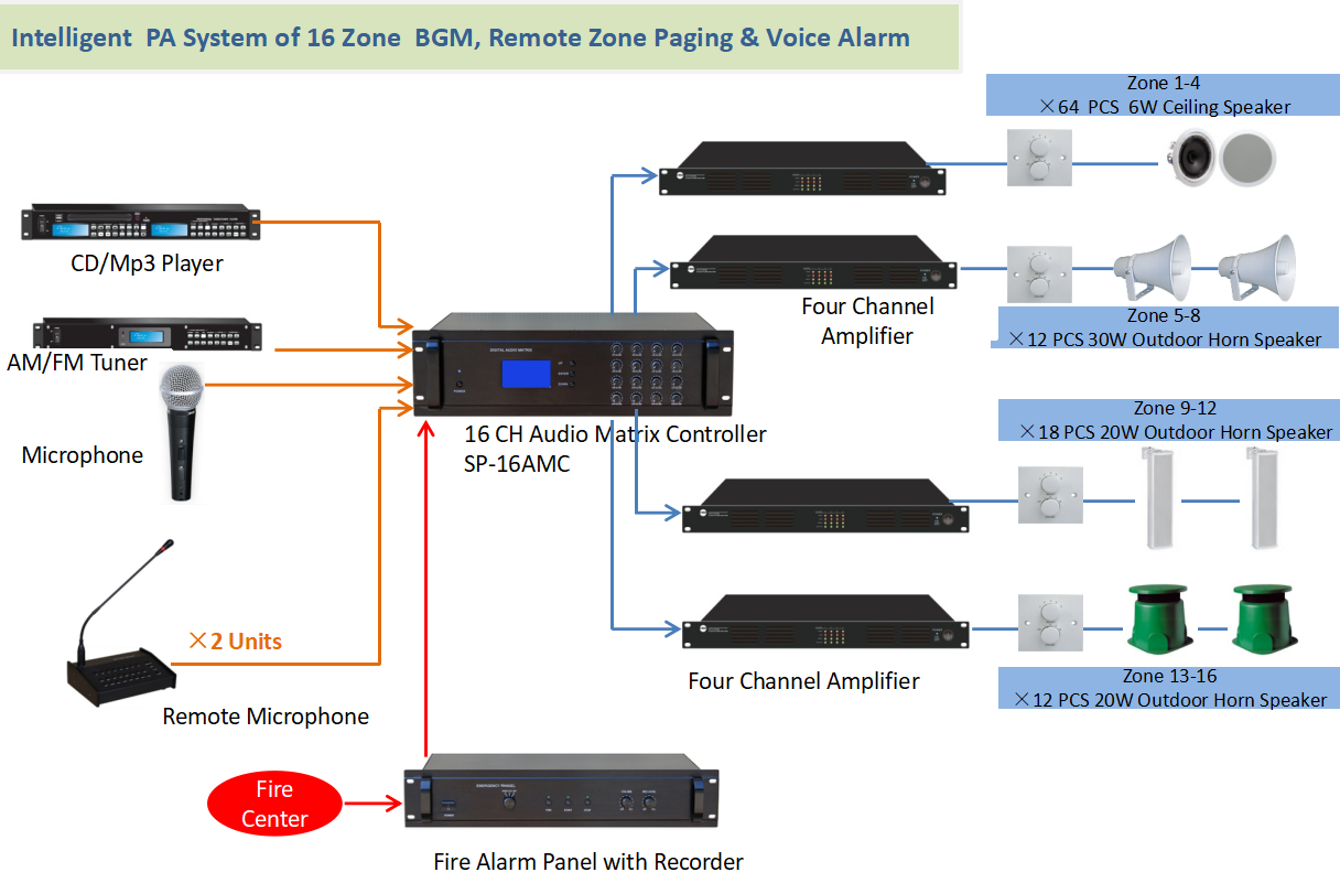 · All in one intelligent PA sound system include 16 channel audio matrix, Mp3 player & USB, 16 zone remote paging system, fire alarm & voice evacuation system interface, weekly scheduled timer and power sequencer.